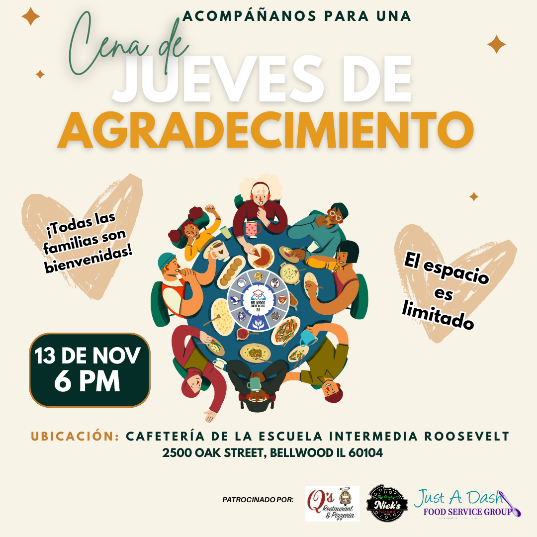 Bellwood School District 88 warmly invites all families to join us for Thankful Thursdays Dinner at Roosevelt Middle School, with the first dinner featuring pizza and pasta, proudly sponsored by restaurants right here in our community!